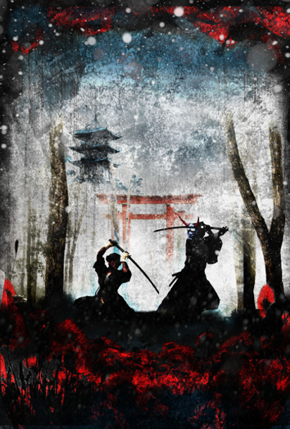 Maybe arriving at the final cover art will prove to be a lot like watching sausages being made (and if that doesn’t put you off eating sausages, nothing will), but I’m going to run down the broad strokes of turning a licensed image into a finished cover. We started with the image of a samurai duel above(“By the Sword”–Artist: Glenn Porter). Also note that when I said “we” up there I mostly mean my editor/publisher Sean Wallace and Prime’s art director, Sherin Nicole. I was in the loop, but mostly as cheerleader.