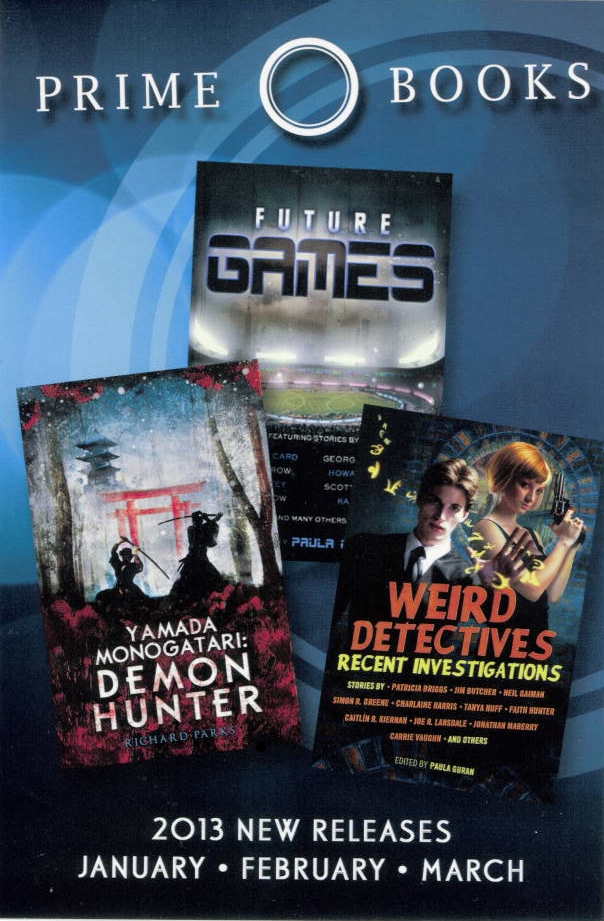 There was a little more going on besides the metaphysical quirks of the house felines. For one thing, I’ve just confirmed that the Yamada novel, To Break the Demon Gate, has been delayed until later this year, probably November. Also, there was the spiffy Prime Books notecard that shipped with the February Locus, including Yamada Monogatari: Demon Hunter along with Future Games and Weird Detectives. Since I’m in 2 out of those 3 books, I rather liked it. Also, LightSpeed Magazine will be reprinting “The Man Who Carved Skulls” in a future issue. I’ll give a date as soon as I have one, but from the writer’s perspective, you gotta love reprints—the work’s already done and you get paid again anyway.