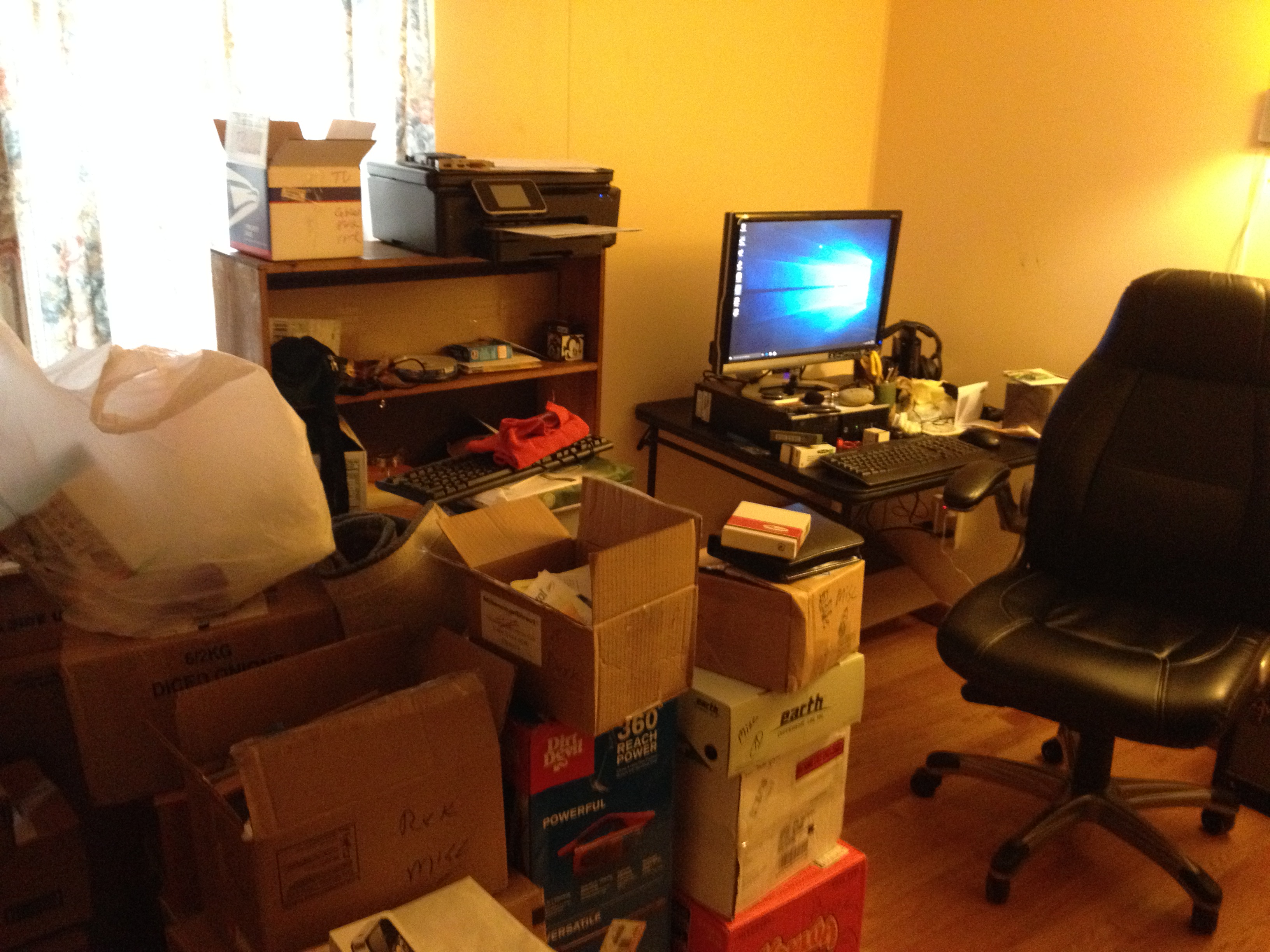 My new office. Or it will be once I figure out what boxes go in the attic and what needs to be unpacked and what sort of physical storage object type thing they need to be unpacked into, and well, you get the idea. Our stuff was delivered (mostly) intact. Which means it all has to be sorted out and placed where it can be most useful. Some of it will likely fall into the “Why did I think I needed this?” category and be purged or stored.