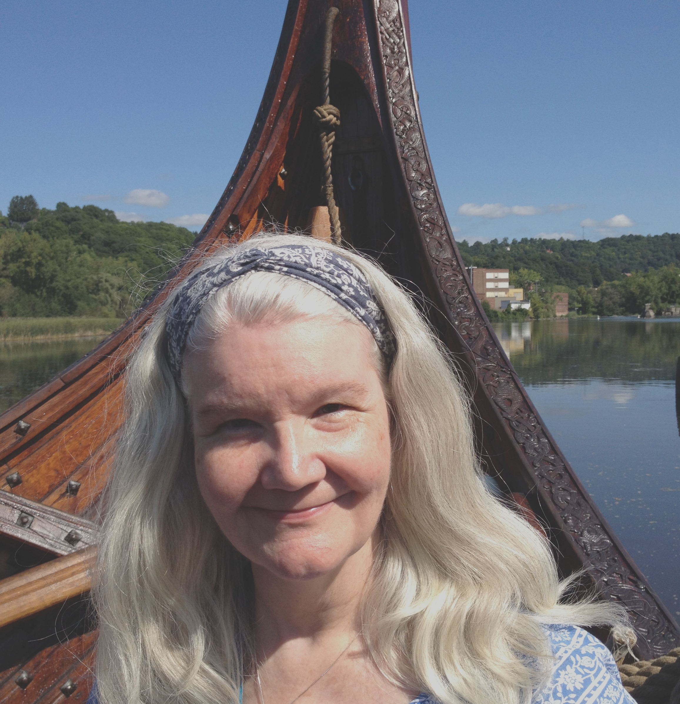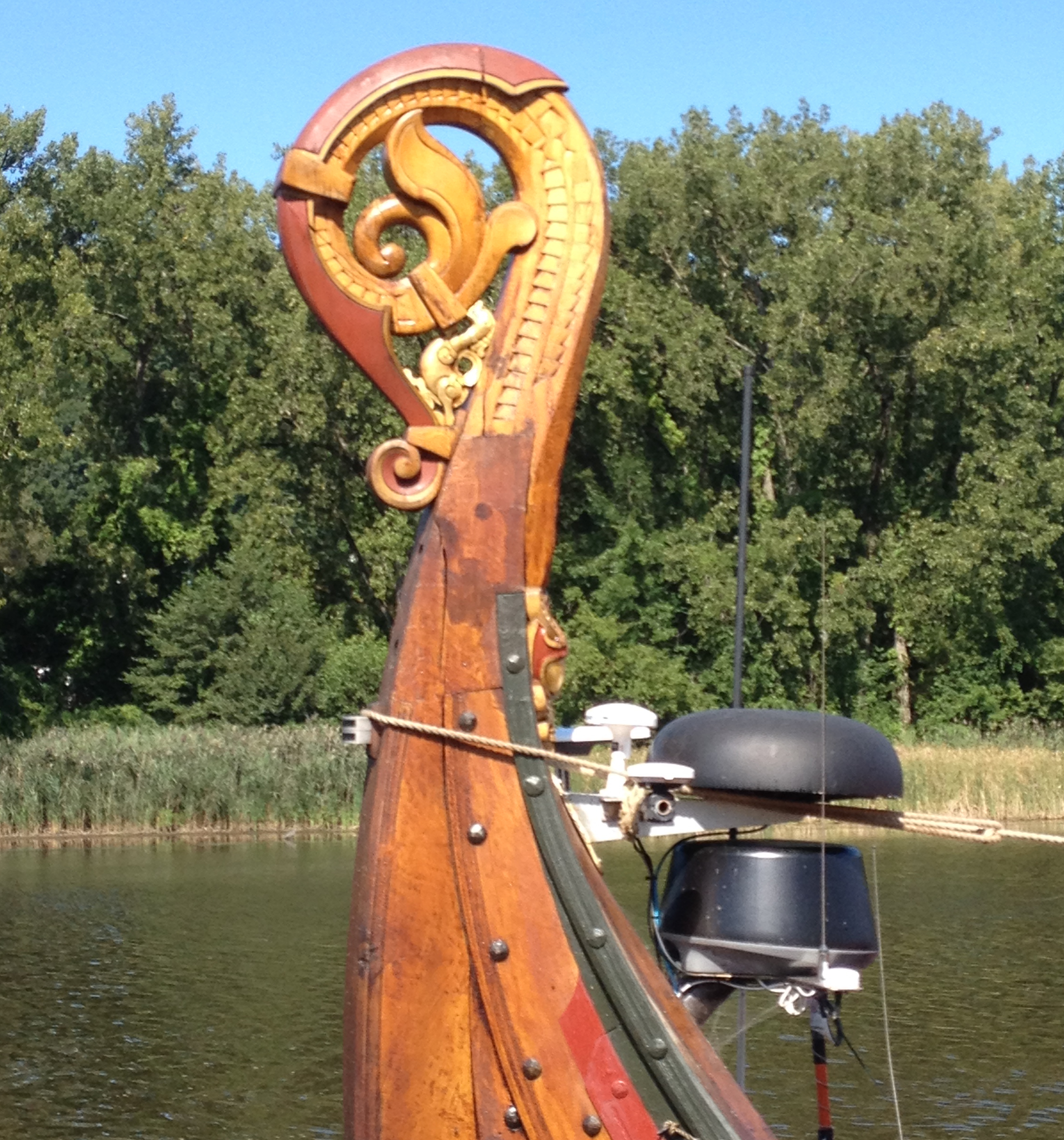 Here is a shot of First Reader standing in the bow looking all Valkyre-ish.. You can see a hint of what the gunwhale carvings looked like to her right.
