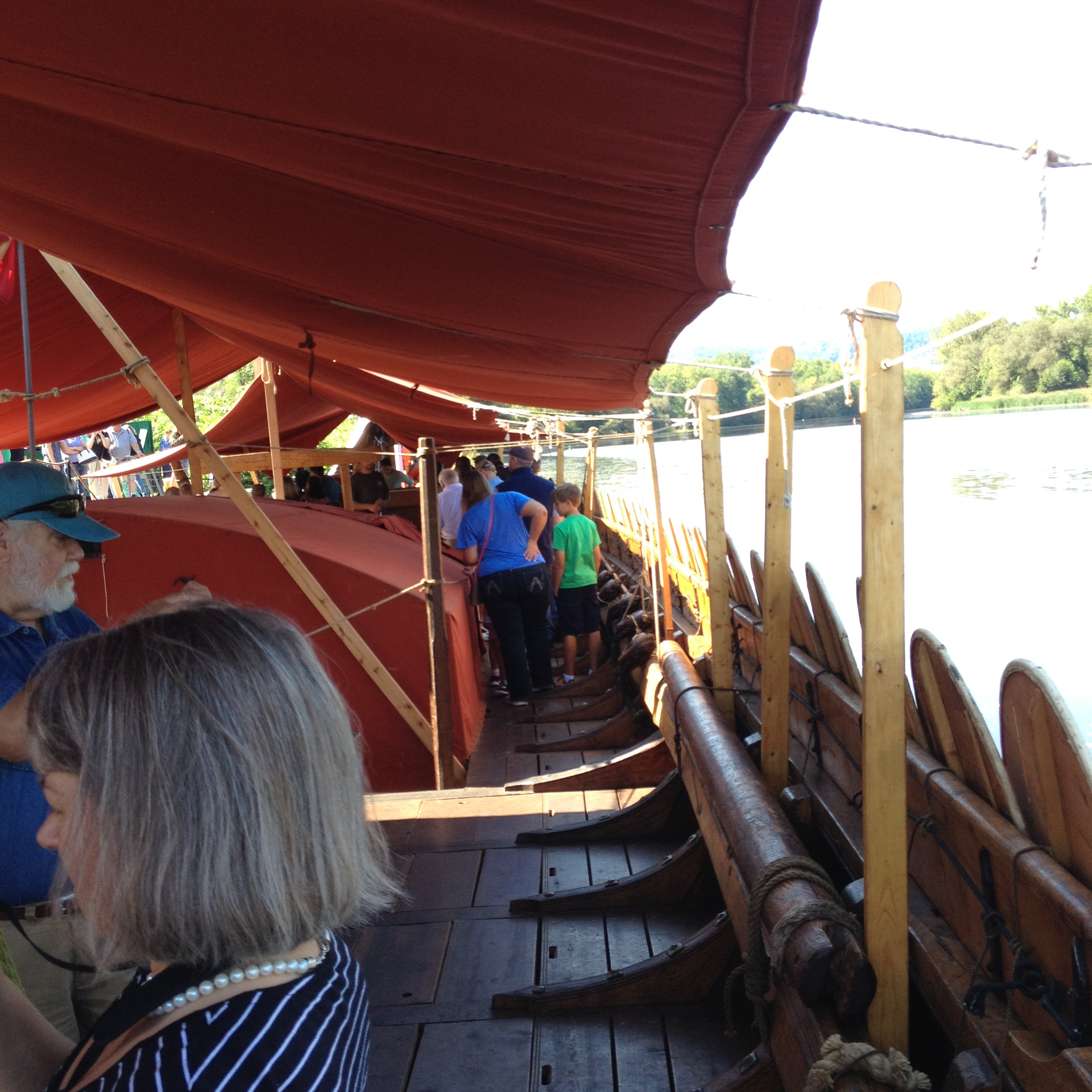 I wasn’t able to get a good shot of the entire ship because of the crowds, but this angle from just past the bow toward the stern will give you an idea of the scale. It is 115 feet long and 26ft wide, yet only draws about 8 feet for a displacement of 90-95 tons. It is capable of being rowed (25 oars to the side, fifty all together) and has a proper sail, but a large vessel can’t sail a barge canal easily or safely so they use a modern engine for that. The reason the viking longship was such an effective raider was that it was flexible enough to travel the open ocean without being pounded apart by the waves but also had a shallow draft so it could easily travel up rivers and raid far inland. One thing that made the vikings so feared was that they could and did strike almost anywhere with no warning.