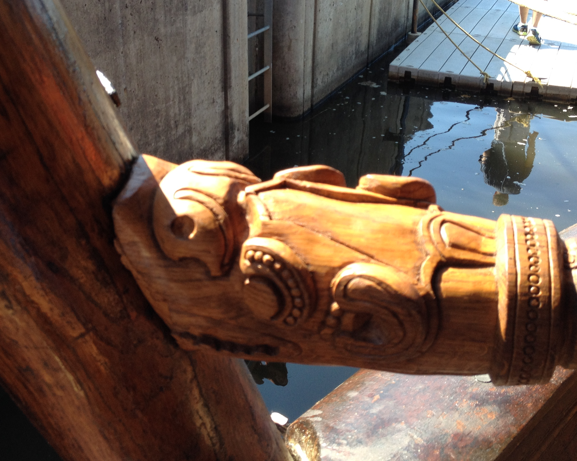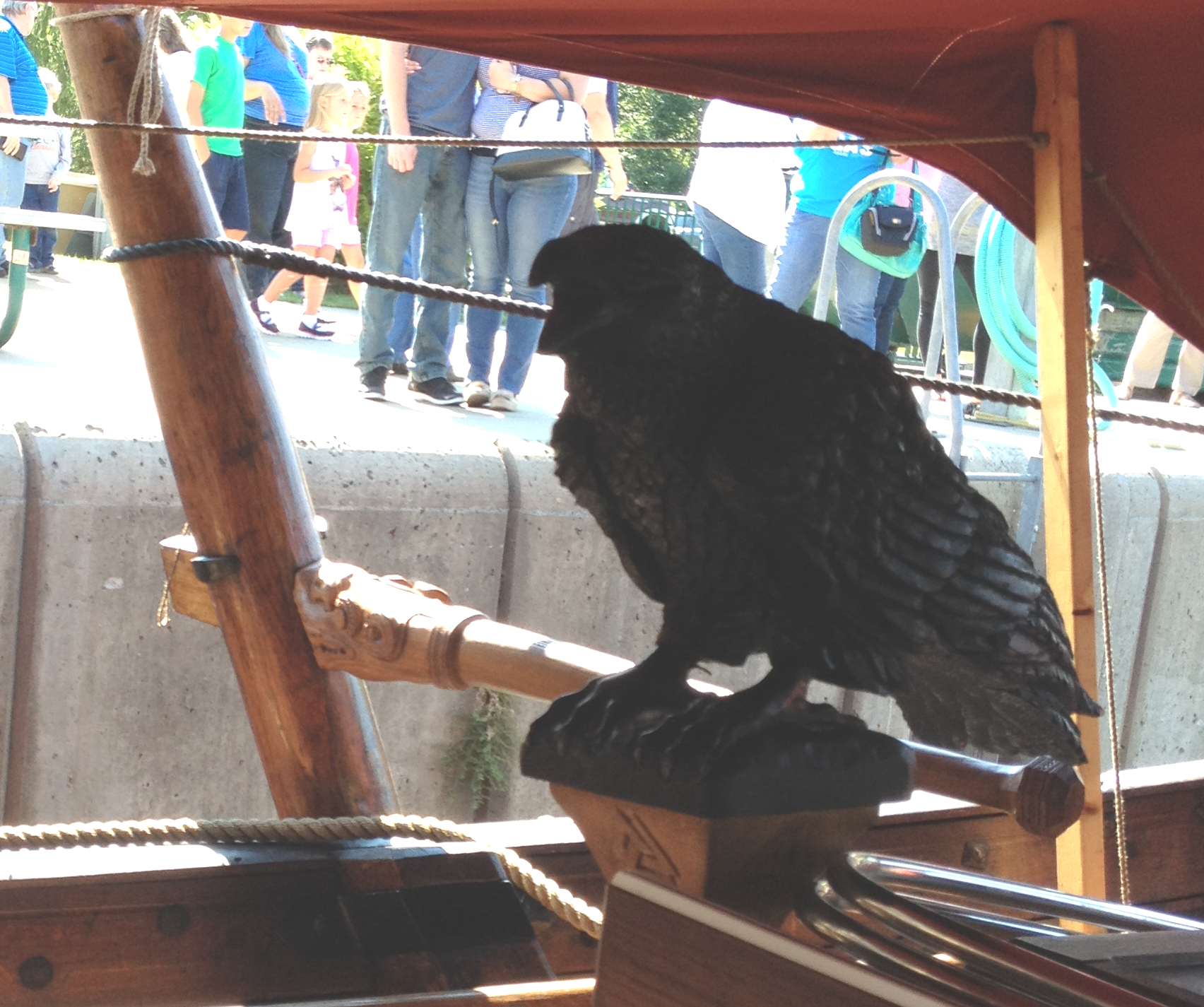 That’s a carving of Hugin (or Munin. I can’t tell them apart) to the right of the steersman’s post as you face the bow. Beyond it you can see the steering oar on the starboard side. On the other side of the steersman’s post is a carving of the other raven. Hugin and Munin (Thought and Memory) were Odin’s ravens. They would travel the world to bring him news and secrets. There’s no historical reason for them to be there, the builders just thought it would be fun. Like the dragon head, the ravens can also be removed and stored.
