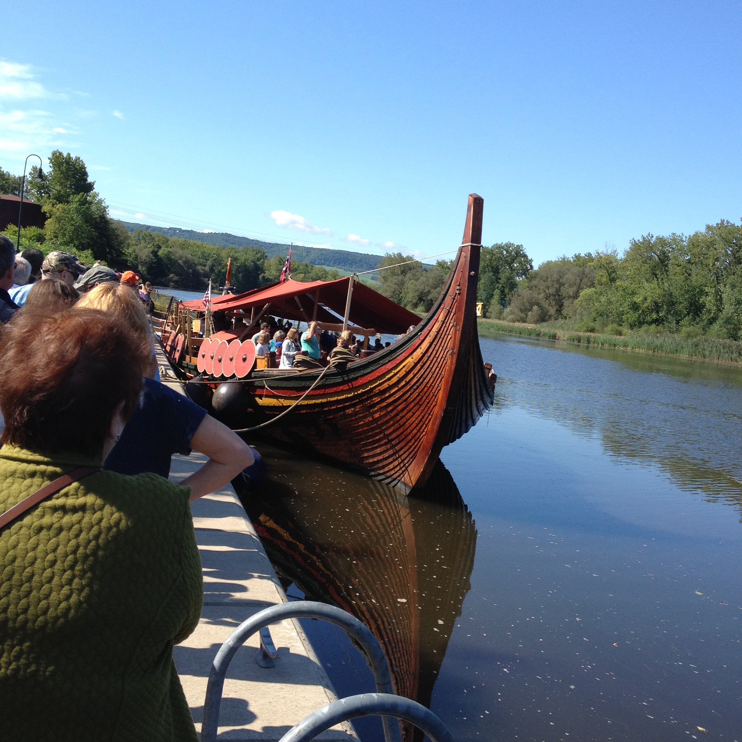 My new home town is situated in a river gorge, and both the Mohawk River and the Erie Canal pass right through it. So we were fortunate that the Draken Harald Hårfagre made it one of their stops in the their Canadian and US tour. The name translates as “Dragon Harald Fairhair.” The Draken Harald Hårfagre is the largest Viking ship built in the current age. Named in honor of King Harald Fairhair (sometimes also translated as “Prettyhair”, the dude clearly had some major locks), the first King of Norway and modeled after the Gokstad Ship. On Saturday and Sunday the ship itself was open for tours, and who with a modicum of interest in history is going to pass up the chance to stand aboard a real viking ship? It’s not like that happens every day. So we braved the crowds and headed down to the marina.