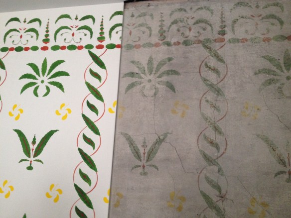 This picture shows the restoration of the original wall stenciling that decorated the tavern. The right side of the picture shows the original stenciling over plaster, sort of like wall paper without the paper. As you can see, the restoration follows the original very closely.