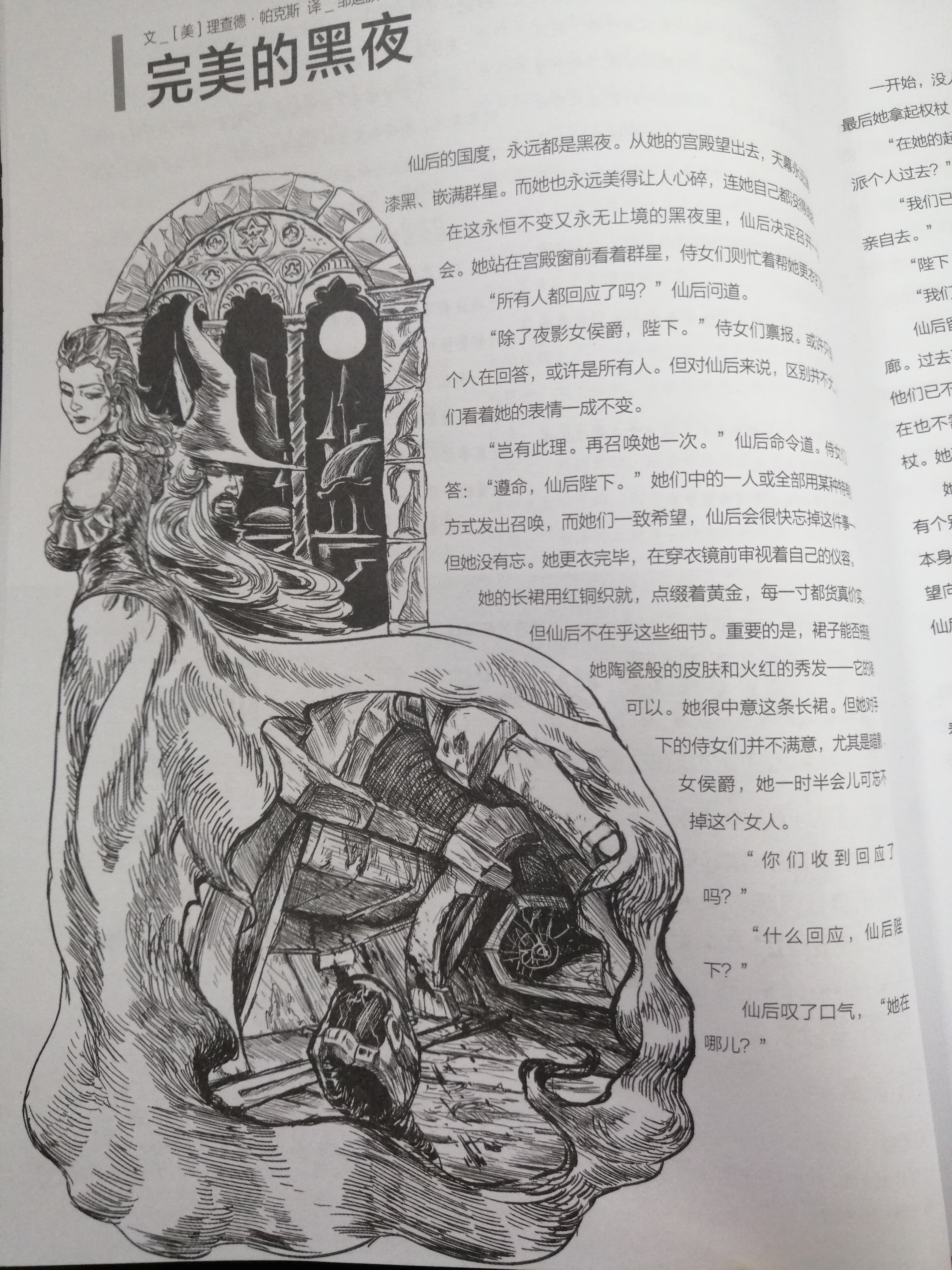 First of all, I have a reprint from Clarkesworld #59, “Night, in Dark Perfection” in Science Fiction World, the Chinese SF Magazine. I’d give the link but it doesn’t seem to be working at the moment (Gov. interference or just a down server, your guess is as good as mine). I do have the illustration, by an artist who wishes to be known as YK. I’ve included a scan of the first page, though I don’t read Chinese, so I’ll take their word for it. 🙂