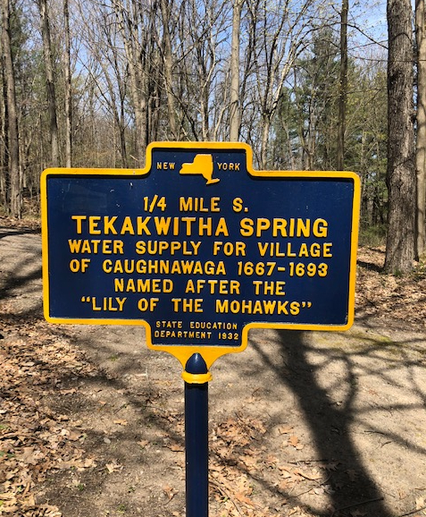 The lady shown above in the not-great statue was a 17th century Native American named Kateri, of Algonquin-Mohawk heritage. First Reader and I took a day trip out to the countryside near Fonda, NY, to visit a sacred spring associated with her. Whether the spring was sacred to the Mohawks is a separate question. It was originally the main water supply to the village where she lived for a time, as shown in the sign below.